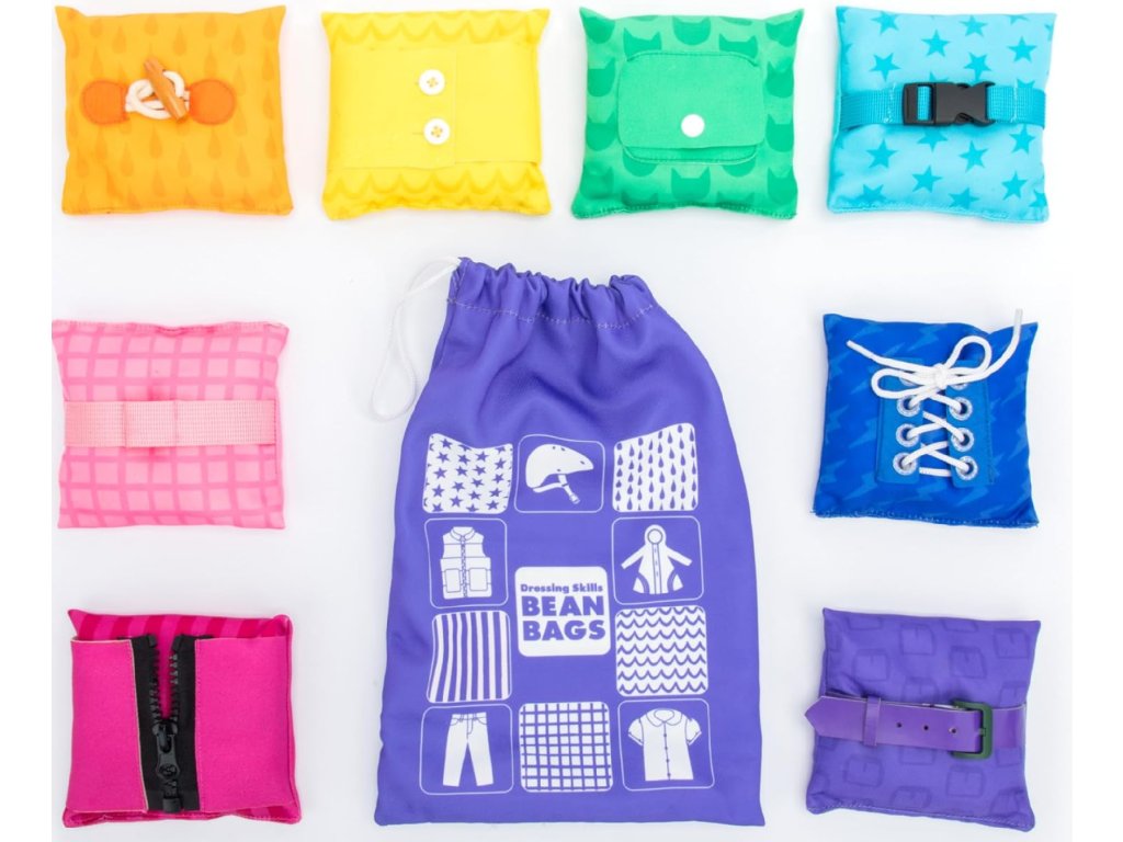 Sada měkkých pytlíčků, která učí děti základním dovednostem při oblékání a rozvíjí jemnou motoriku. Hravý způsob, jak se naučit zapínat knoflíky, zipy a další zapínání.