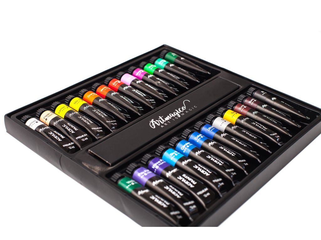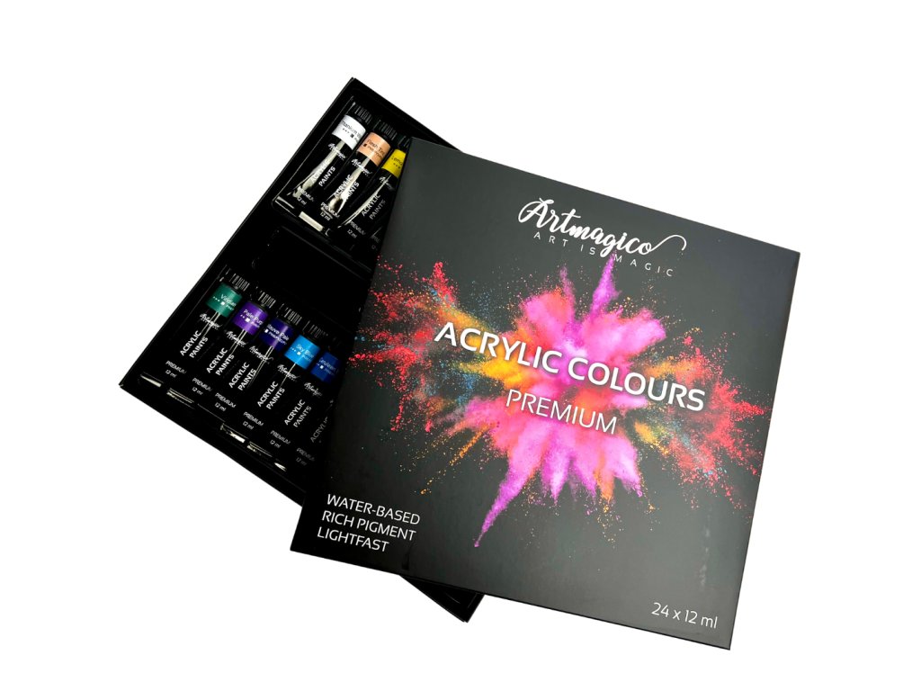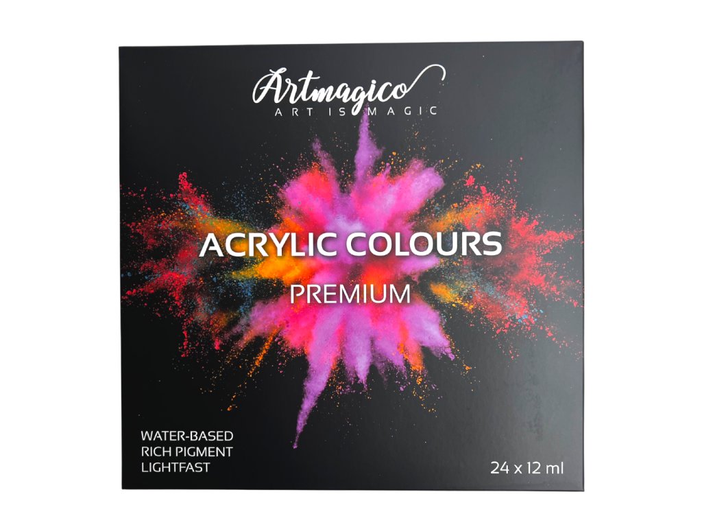 Akrylové barvy Artmagico jsou určené k umělecké tvorbě. Barvy jsou založené na vodní bázi a vynikají vysokým obsahem pigmentu, který zaručuje jejich perfektní krycí vlastnosti i na tmavém povrchu. Praktické dárkové balení barev Artmagico potěší každého umělce ať už se jedná o profesionála nebo nadšence. Akrylové barvy jsou skvělé pro práci na každém povrchu - od dřeva, plastu, plátna, kartonu až po koženku nebo látku. Barvy jsou vodou ředitelné a po zaschnutí se stávají voděodolné. Barvy Vás okouzlí lesklými, zářivými odstíny a krémovou konzistencí, díky tomu je využijete ke všem typům akrylové malby od práce štětcem, přes špachtle, až po strukturální malbu. Vynikají rychleschnoucími vlastnostmi.