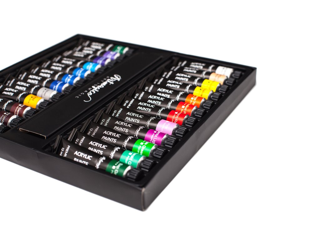Premium quality acrylic paints in a practical pack of 24 tubes, each containing 12 ml. Acrylic paints have beautiful, rich colors and perfect covering properties. They are glossy when dry.