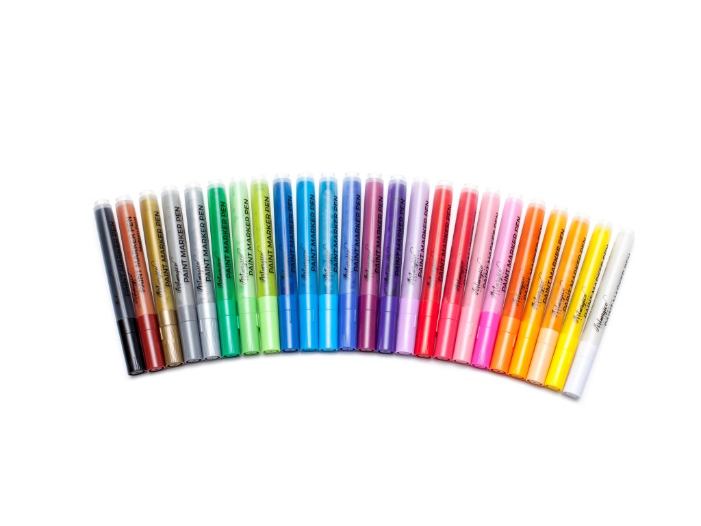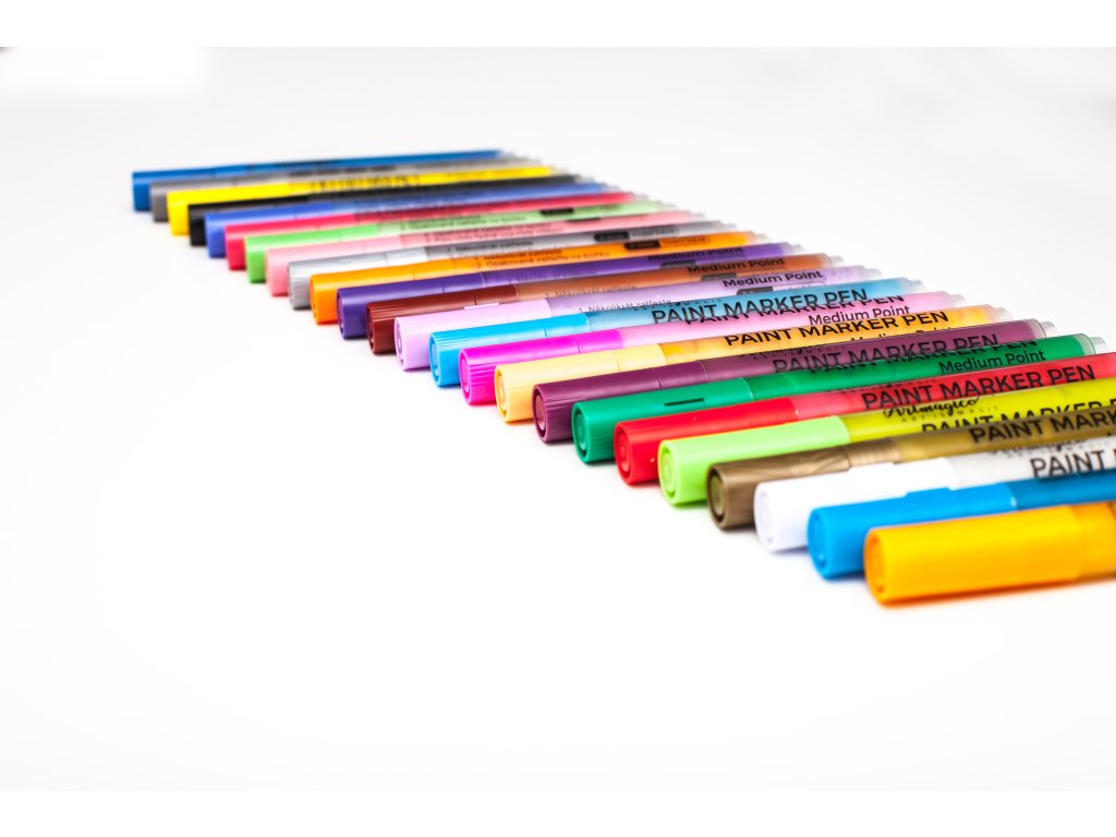 Acrylic markers in a set of 24 pieces with a medium tip and a line width of 2-3 mm in premium quality. Perfect ink with excellent coverage, suitable for all types of painting and creative work. The wider tip is ideal for coloring larger areas.