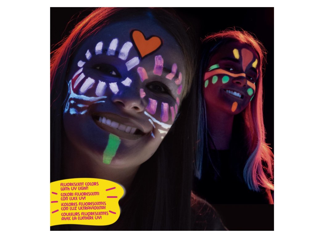 Neonové barvy jsou bezpečné a vhodné pro použití na pokožce, což zajišťuje jejich použitelnost pro děti i dospělé. Jsou odolné a snadno se nanáší i stírá, což umožňuje experimentovat s různými tvary a vzory. Perfektní pro použití na dětských párty, kostýmových akcích, festivaly nebo pro každodenní tvoření.