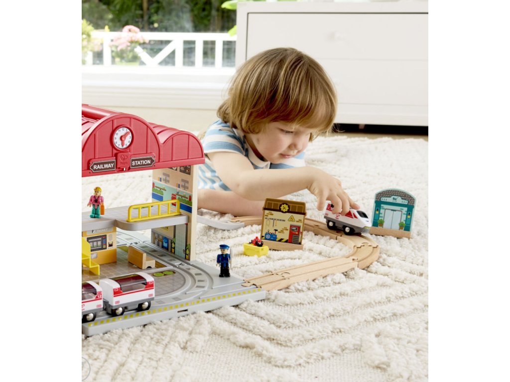 Hape Portable Train Station Set – Přenosná vláčkodráha pro malé cestovatele