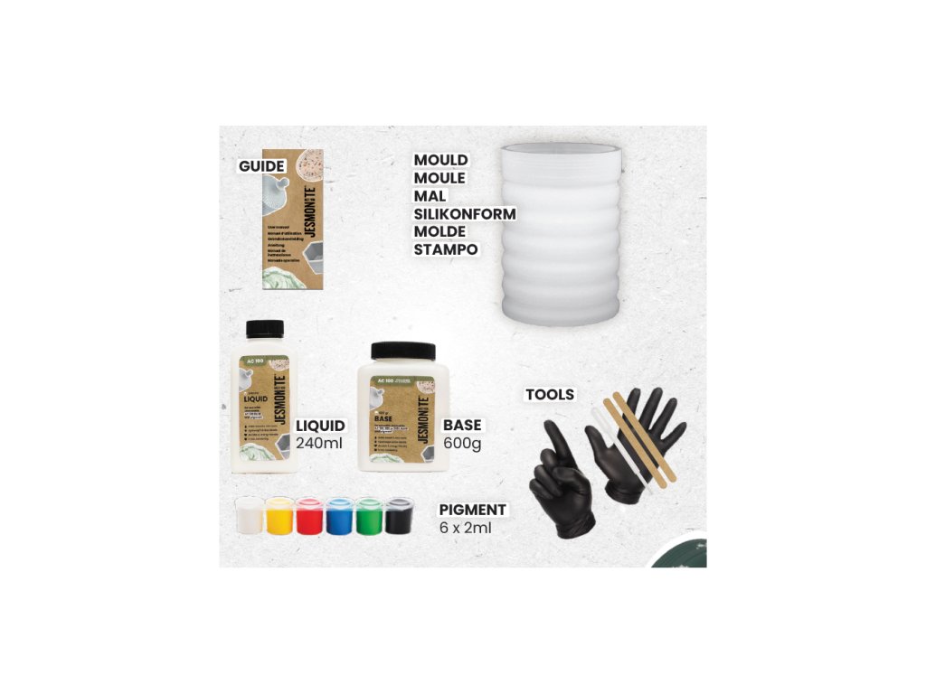 - obsahuje: návod, tekutou složku 240 ml Jesmonite Liquid, suchou složku 600 g Jesmonite Base, silikonovou formu (znovu použitelnou), nástroje - 2 míchací tyčinky a 1 pipeta, 1 pár rukavic a pigmenty 6 x 2 ml