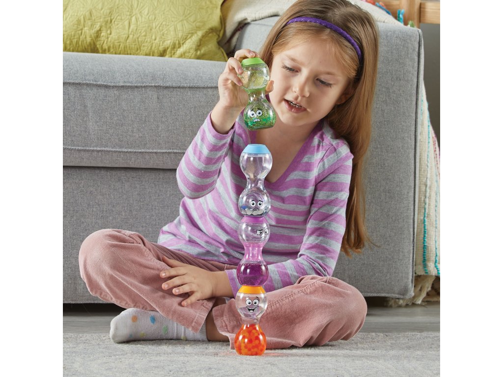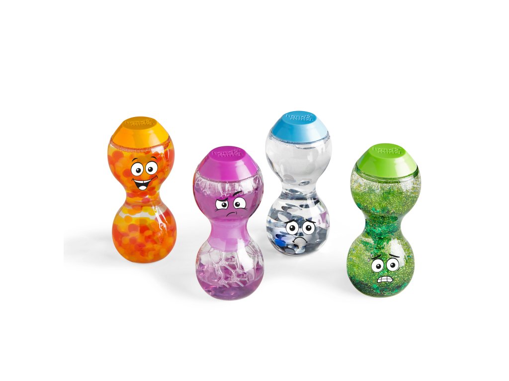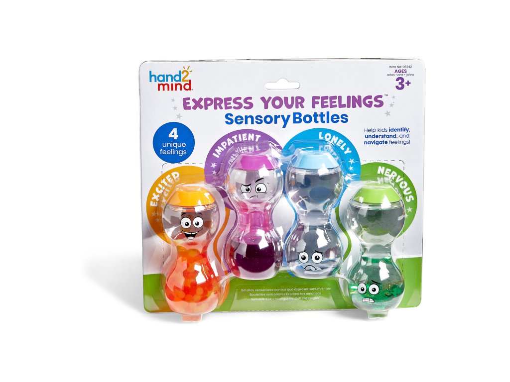 Sada Express Your Feelings™ od značky Hand2Mind představuje zábavný způsob, jak dětem přiblížit základní emoce. Každá z lahví obsahuje pohyblivou barevnou tekutinu, která vizuálně reprezentuje konkrétní pocit. Děti se učí rozlišovat emoce nejen podle výrazu tváře, ale i podle barvy a pohybu tekutiny.