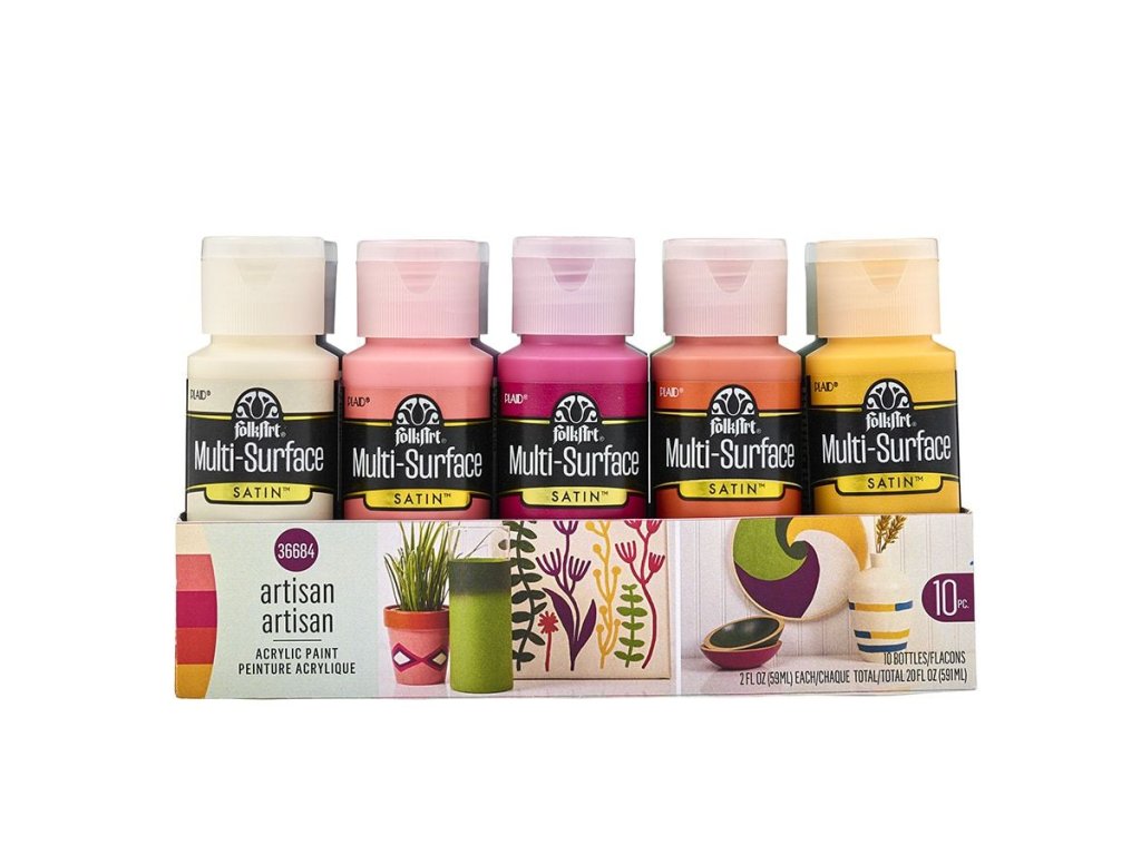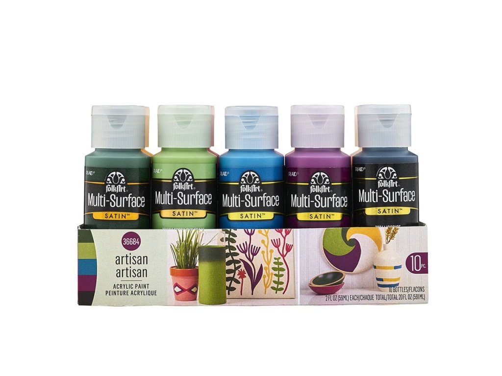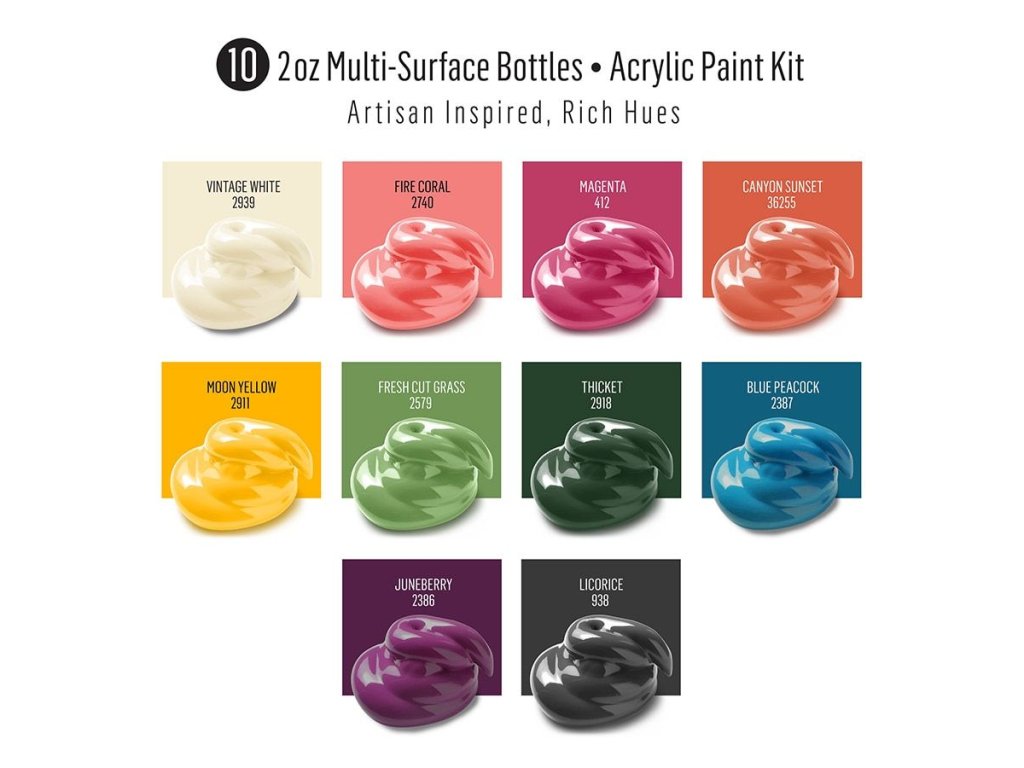 FolkArt Multi-Surface, Artisan 10-piece Acrylic Paint Set obsahuje 10 živých a nadčasových barev s krémovou konzistencí a vynikající kryvostí. Tato všestranná sada akrylových barev je ideální pro různé povrchy, včetně dřeva, plátna, skla, textilu a keramiky.