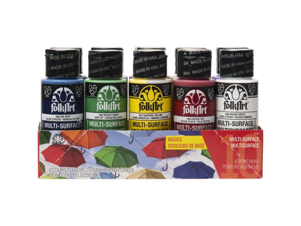 FolkArt 10-piece Multi-Surface Basics Acrylic Paint Set obsahuje 10 základních barev s krémovou konzistencí a vynikající kryvostí. Tyto akrylové barvy schnou do krásného saténového povrchu a jsou vhodné pro různé povrchy, včetně dřeva, plátna, kovu a dalších.