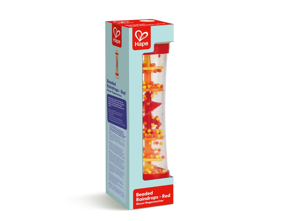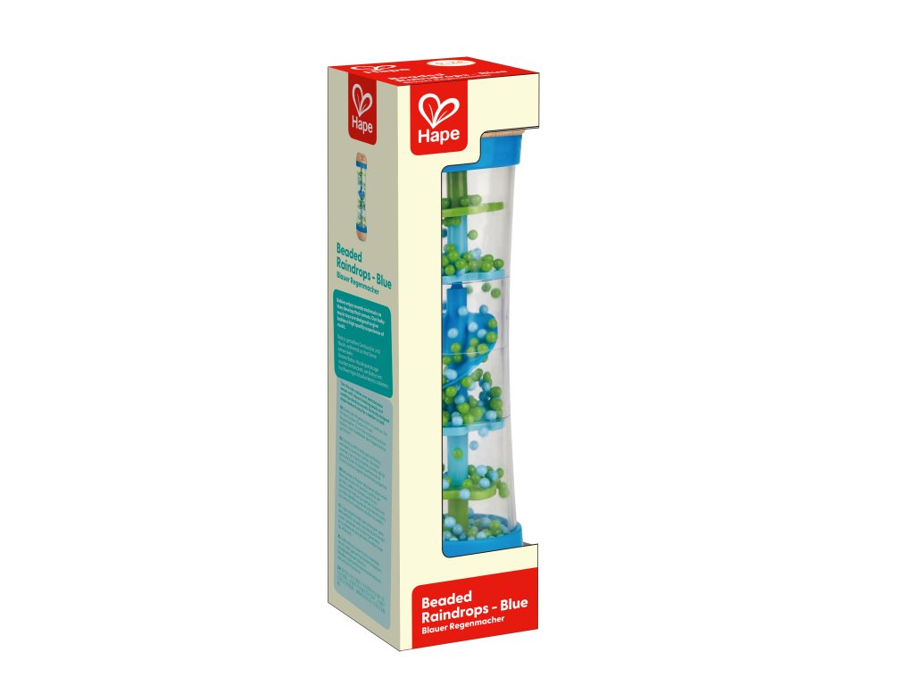 Beaded Raindrops od značky HAPE přináší jedinečný sluchový zážitek. Při otáčení válce se barevné korálky pomalu přesýpají a vytvářejí uklidňující zvuk podobný dešti. Tato hračka stimuluje nejen sluch, ale také zrak – díky kontrastním barvám a pohybu korálků.