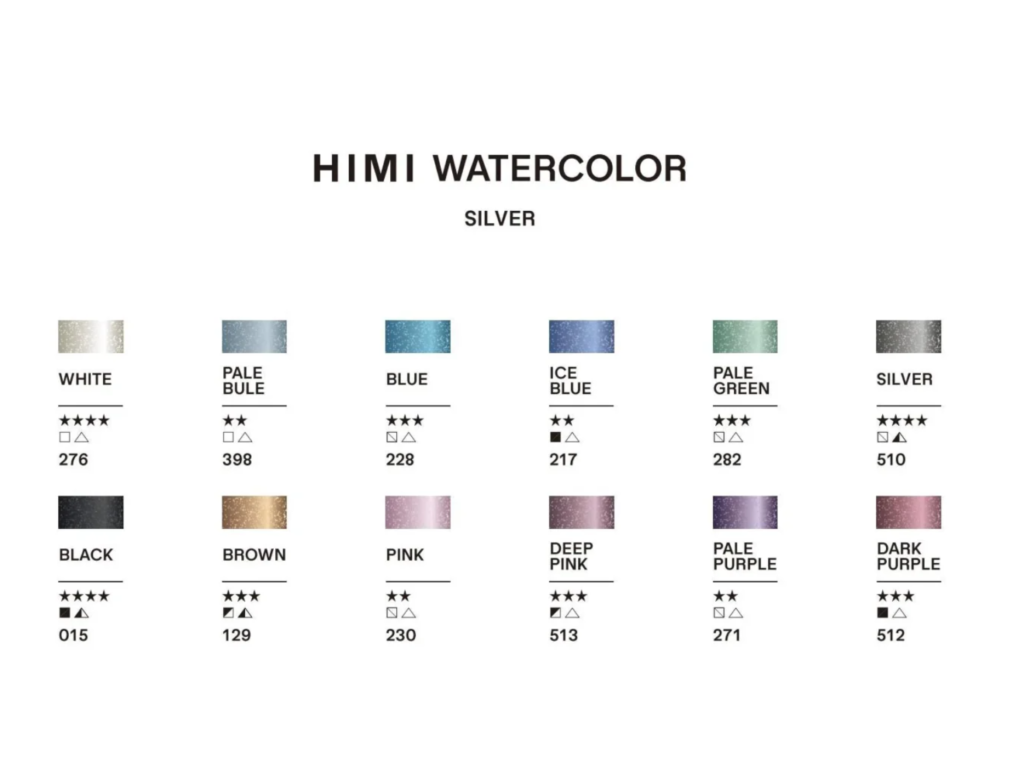 Tato speciální edice akvarelů HIMI je určena pro dekorativní malbu, kaligrafii a iluminaci. Barvy se vyznačují jemným mletím kovových pigmentů, které po zaschnutí nepráší a zachovávají si vysoký index lomu světla. Jsou plně rozpustné ve vodě a lze je snadno mísit pro dosažení unikátních metalických nuancí.