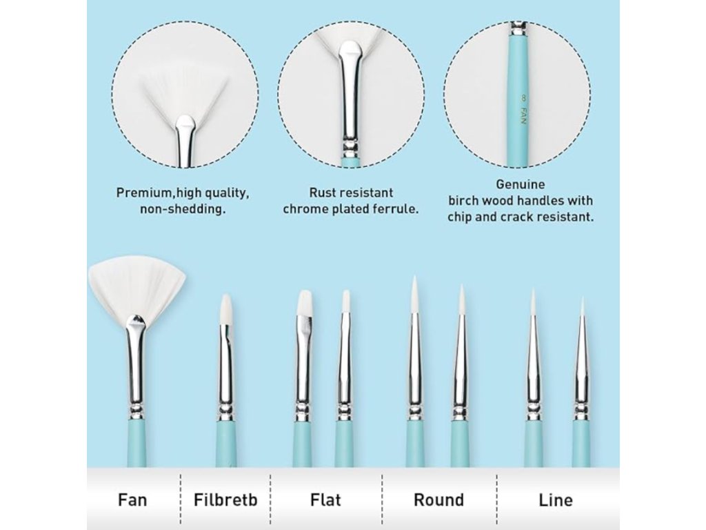 - Počet štětců: 8 různých tvarů (ploché, kulaté, vějířovité, filbert)