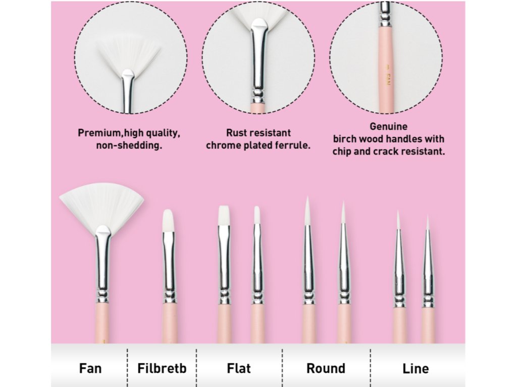 - Počet štětců: 8 různých tvarů (ploché, kulaté, vějířovité, filbert)