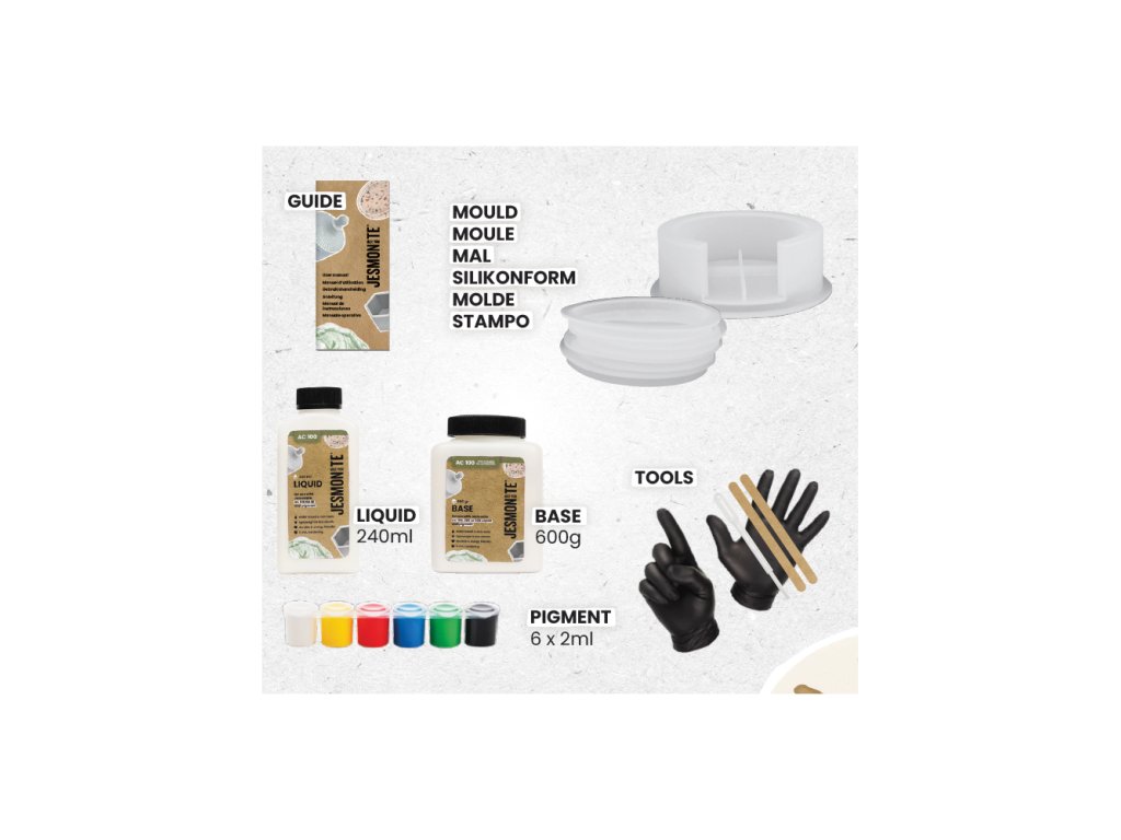- obsahuje: návod, tekutou složku 240 ml Jesmonite Liquid, suchou složku 600 g Jesmonite Base, 5 silikonových forem (znovu použitelných), nástroje - 2 míchací tyčinky a 1 pipeta, 1 pár rukavic a pigmenty 6 x 2 ml