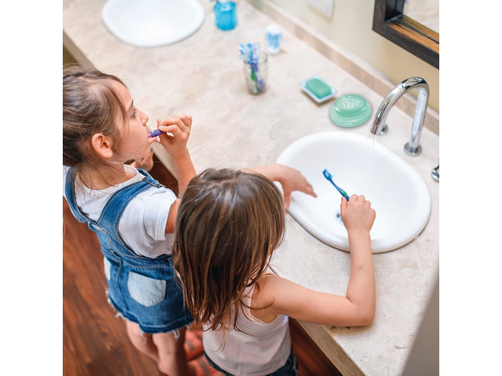 Barevný světélkující časovač, který usnadňuje dodržet doporučenou dobu čištění zubů – dvě minuty. Děti stisknou tlačítko, časovač se spustí a světýlko je provází během čištění. Po uplynutí času zazní zvukový signál, který upozorní, že je čištění dokončeno. Tento pomocník pomáhá vytvořit zdravý návyk pravidelné péče o zuby už od útlého věku.