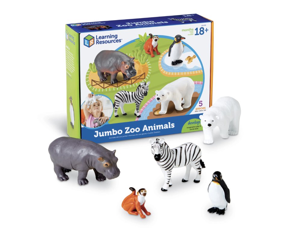 Learning Resources Jumbo Zoo Animals – Didaktická sada 5 velkých zvířat Sada realisticky ztvárněných modelů zvířat v nadstandardní velikosti, navržená pro rozvoj slovní zásoby, kognitivních schopností a imaginativní hry v předškolním vzdělávání. Modely splňují nejpřísnější bezpečnostní normy pro hračky (EN71).