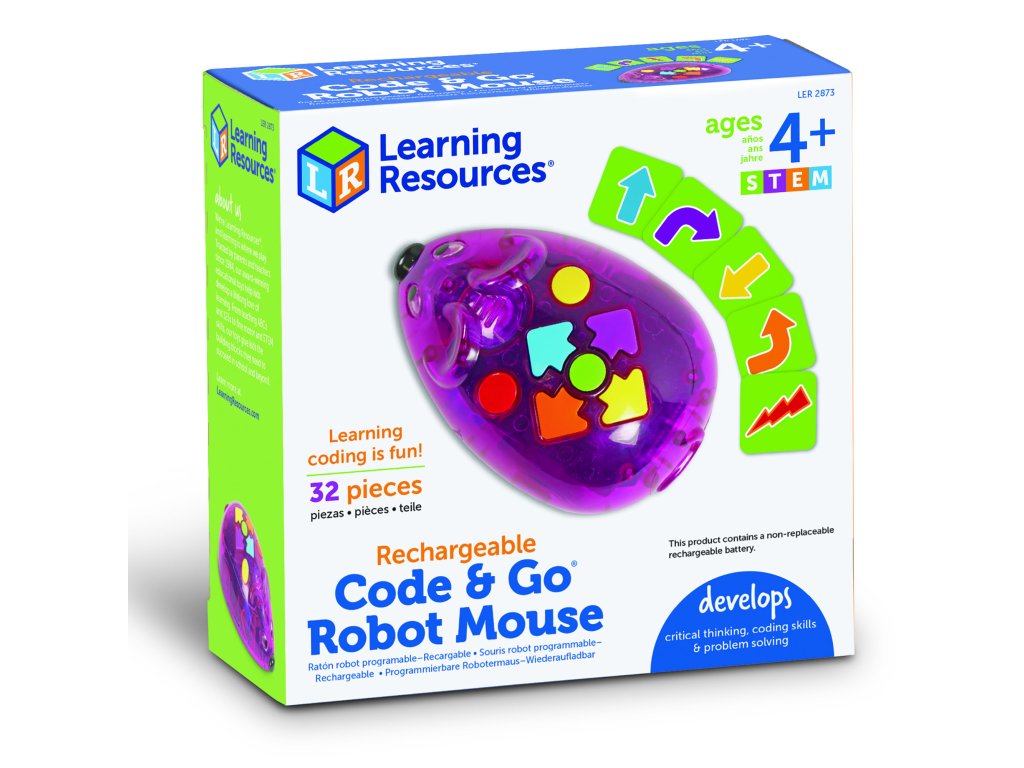 Learning Resources Sada aktivit s myší Code & Go® – dobíjecí přináší bezdrátový a udržitelný zážitek z programování – v balení najdete programovatelnou robotickou myš s osvětlením, zvukovými efekty, dvěma rychlostmi a intuitivními tlačítky nadupanými pro kódování.