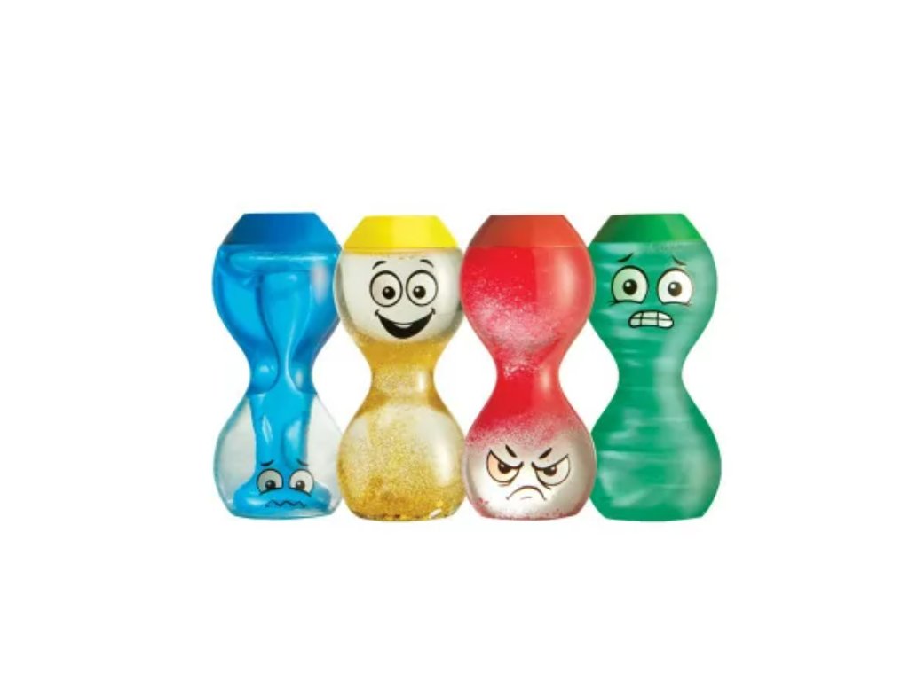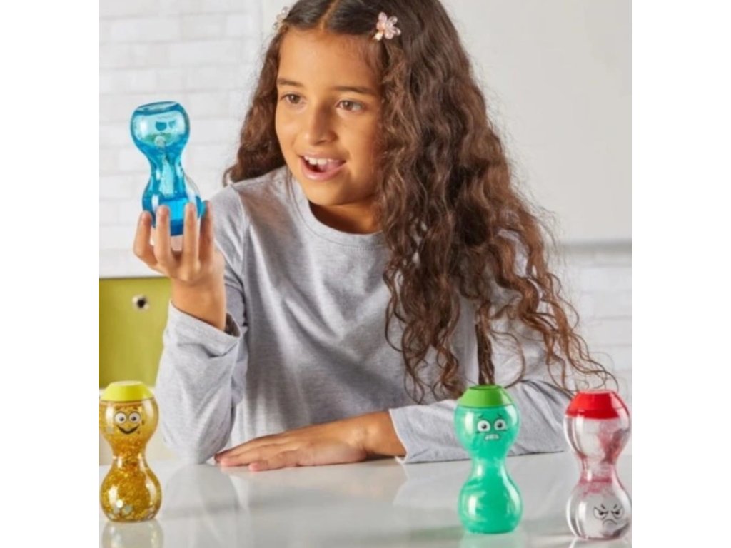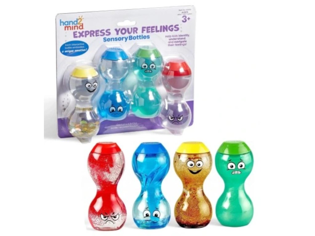 Sada Express Your Feelings™ od značky Hand2Mind představuje zábavný způsob, jak dětem přiblížit základní emoce. Každá z lahví obsahuje pohyblivou barevnou tekutinu, která vizuálně reprezentuje konkrétní pocit. Děti se učí rozlišovat emoce nejen podle výrazu tváře, ale i podle barvy a pohybu tekutiny.
