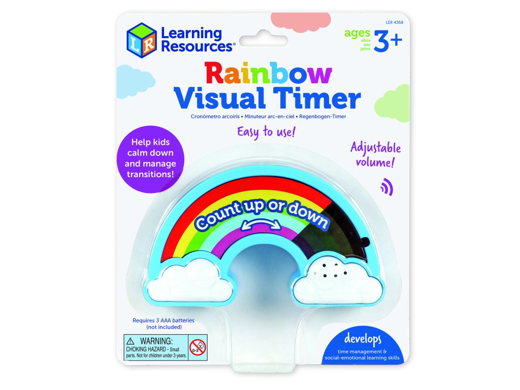 Vizuální časovač Learning Resources Rainbow je moderní pomůcka, která pomáhá dětem i dospělým lépe porozumět plynutí času. Barevný odpočet v podobě duhového pásma umožňuje snadno sledovat, kolik času zbývá na určitou aktivitu. Díky tomu se děti učí plánovat, soustředit se a dokončovat úkoly v určeném čase.