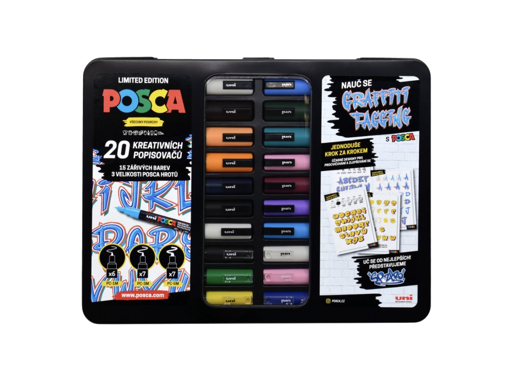 Limitovaná edice Posca Graffiti Tagging obsahuje 20 různobarevných popisovačů ve velikostech 1M, 3M a 5M, exkluzivní vzory od umělce SPZero, barevné návody dvou graffiti stylů a cvičné listy. Vše zabalené v praktické plechové krabičce, která je vhodná i jako dárkové balení.